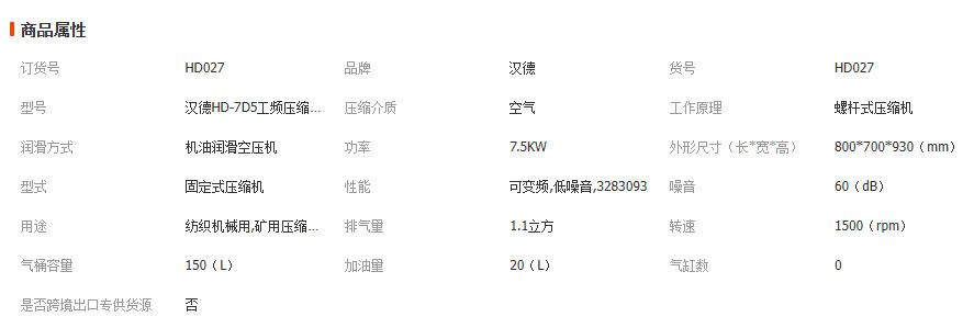 汉德HD-7D5 螺杆压缩机 7.5KW 汉德10A 10P螺杆空压机 1台